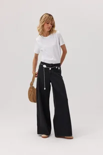 Czarne jeansy Onda to propozycja dla osób ceniących klasykę w nowoczesnym wydaniu. Fason spodni jest szeroki, lekko rozszerzany ku dołowi, co gwarantuje wygodę oraz podkreśla stylowy, swobodny look. Regularna talia, klasyczne przeszycia i metalowy guzik z logo Anataki dodają im charakteru. Model posiada klasyczne kieszenie z przodu i z tyłu oraz szlufki na pasek, Szerokie, lekko rozszerzane nogawki Regularna talia Metalowy guzik oraz skórzana naszywka z logo Anataki Klasyczne kieszenie z przodu i z tyłu Szlufki na pasek Skład: 100% bawełna Wzrost modelki 178 cm Wymiary produktu dla rozmiaru 36: