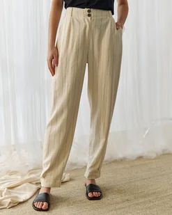 Opis Produktu: Kolor: Ecru — delikatny, jasny odcień, idealny na wiosenne i letnie dni. Skład Materiału: Len i wiskoza — połączenie naturalnych materiałów zapewniających komfort i oddychalność. Fason: Luźne z fałdami u dołu nogawki — modny, swobodny krój, który podkreśla luz i wygodę.