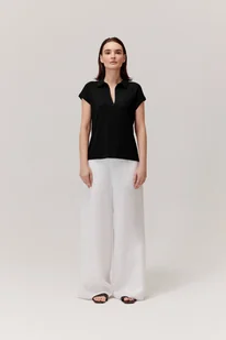 Najważniejsze cechy: Szyte w Polsce z lnu o wysokiej jakości; Materiał: 100% len – przewiewny, z charakterystycznym splotem i matowym wykończeniem; Fason: szerokie spodnie typu palazzo z wysokim stanem; Występujące kolory: biały, czarny, niebieski, gorzka czekolada – klasyczne i ponadczasowe; Detale: