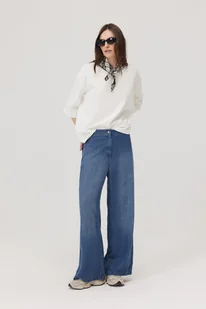 Najważniejsze cechy: * zapięcie na dwa metalowe guziki i zamek * szerokie nogawki rozszerzające się ku dołowi * kolor jeansowy z kontrastowymi stębnowaniami * miękko układający się lyocell Skład: 100% lyocell Rozmiar: 34, 36, 38, 40, 42, 44