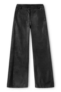 Wzór: idealna imitacja naturalnej skóry. Fason: te długie spodnie z szeroką nogawką będą wyglądały tak samo dobrze w towarzystwie kowbojek, sandałów i szpilek. Klasyczne szlufki i proste kieszenie nadają spodniom charakteru. Szyte w Polsce. Skład: 50% polyurethan, 40% wiskoza, 10% poliester