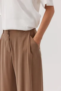 Stan na linii pasa Boczne kieszenie częściowo ukryte w zaszewkach Szlufki naszyte z przodu Zapięcie na dwa guziki i suwak Z tyłu zaszewki i listwowe kieszenie Szyte w Polsce Skład: 100% lyocell Wymiary produktu dla rozmiaru 34: Długość całkowita - 108 cm Obwód w talii - 70 cm Obwód w biodrach - 106 cm Każdy kolejny rozmiar zwiększa się o 4 cm w obwodach (nie dotyczy długości całkowitej). Rozmiar: 34, 36, 38, 40, 42
