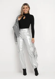 Srebrne Szerokie Spodnie Bojówki o Metalicznym Efekcie Ekklla