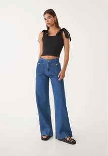 Jeansy z wysokim stanem, kieszeniami naszytymi z przodu z guzikiem w złotym kolorze, kieszeniami naszytymi z tyłu, rozszerzanymi nogawkami i zapięciem na suwak i guzik. Dostępne w różnych kolorach.