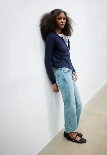 Dżinsy cropped dzwony z wysokim stanem i szlufkami w pasie. Z przodu kieszenie i naszyte kieszenie z tyłu. Krótkie nogawki i postrzępione wykończenie dołu. Zapięcie z przodu na zamek błyskawiczny i metalowy guzik. Dostępne w różnych kolorach.