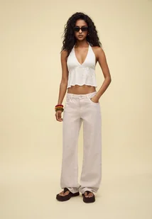 Jeansy z szerokimi nogawkami i niskim stanem, z paskiem ze szlufkami. Kieszenie z przodu i naszyte kieszenie z tyłu. Prosta nogawka. Zapięcie z przodu na zamek błyskawiczny i metalowy element.