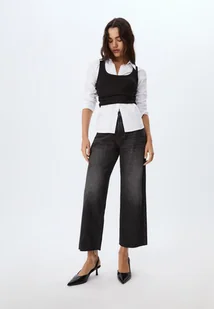Jeansy o kroju straight cropped ze średnim stanem i pasem ze szlufkami. Kieszenie przednie i naszyte kieszenie z tyłu. Proste nogawki i dół do kostek z postrzępionym wykończeniem. Zapięcie z przodu na zamek błyskawiczny i metalowy guzik.