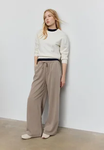 Długie, luźne spodnie z szerokimi nogawkami i regulowaną talią ze sznurkami w tym samym odcieniu. Detal w postaci kieszeni po bokach. Dostępne w różnych kolorach.