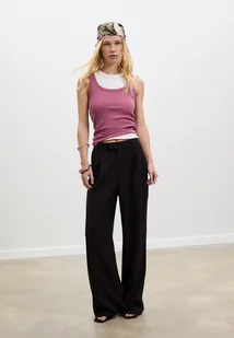 Eleganckie spodnie relax fit ze średnim stanem i elastyczną talią z tyłu ze szlufkami. Przednie kieszenie. Detal z zaszewkami z przodu. Prosta i lejąca nogawka. Zapięcie z przodu na zamek błyskawiczny, wewnętrzny guzik i metalowy element.