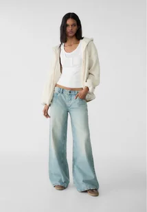 Jeansy z niskim stanem, szlufkami, kieszeniami z przodu, kieszeniami naszytymi z tyłu, szerokimi nogawkami i zapięciem z przodu na suwak i metalowy guzik.