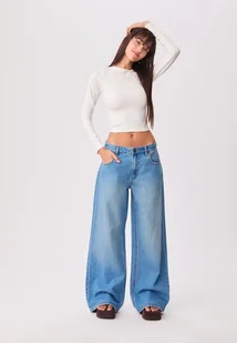 Jeansy baggy o średnim stanie i pasie ze szlufkami. Kieszenie z przodu oraz naszyte kieszenie z tyłu. Luźne nogawki o prostym kroju. Zapięcie z przodu na zamek błyskawiczny i metalowy element w postaci guzika. Dostępne w kilku kolorach.