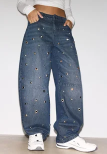 Jeansy baggy ze średnim stanem. Pas ze szlufkami i pięcioma kieszeniami. Zapięcie z przodu na zamek błyskawiczny i metalowy element. Detal w postaci oczek z przodu.