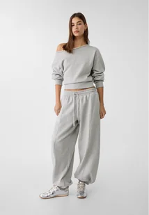 Spodnie ze średnim stanem, gumką i sznurkami w pasie. Boczne kieszenie. Ozdobne szwy z przodu. Szerokie nogawki ze ściągaczami. Dostępne w różnych kolorach.