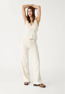 Spodnie straight uszyte z tkaniny wiskozowej z domieszką lnu. Średni stan i pas ze szlufkami regulowany sznurkami i wiązaniem. Kieszenie z przodu. Ozdobny haftowany detal. Prosta nogawka.