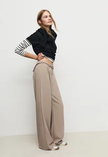 Spodnie o luźnym kroju z wysokim stanem i bocznymi kieszeniami. Elastyczna talia z tyłu z regulowanymi szlufkami i metalową klamrą z przodu. Prosta i szeroka nogawka z zakładkami z przodu. Zapięcie z przodu na zamek błyskawiczny, wewnętrzny guzik i metalowy haczyk.