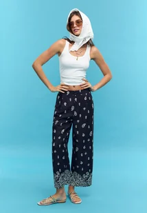 Zwiewne spodnie culotte uszyte z tkaniny z wiskozy z domieszką lnu, z wzorem typu paisley przypominającym chustę. Wysoki stan z elastyczną talią z tyłu zapewnia większy komfort i dopasowanie. Boczne kieszenie. Zaszewki z przodu. Szeroka, prosta nogawka z krótkim wykończeniem do kostki.