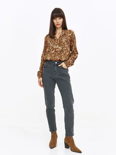 Spodnie damskie Top Secret z delikatnie podwyższonym stanem. Cenione za swój klasyczny krój oraz dużą wygodę podczas użytkowania spodnie damskie jeansowe z prostymi długimi nogawkami, zakończonymi delikatnym przeszyciem. Posiadają one podwyższony stan, będąc zapinanymi z przodu na guzik oraz suwak, a uroku dodają im praktyczne kieszenie umiejscowione zarówno z przodu, jak i również naszyte z tyłu oraz szlufki celem założenia paska. Zostały one uszyte z trwałej oraz przyjemnej w dotyku tkaniny jeansowej, sprawdzając się przeróżnych kobiecych pomysłach stylizacyjnych, zarówno do pracy, jak i również na co dzień. Spodnie damskie dostępne w kolorze szarym TSKS25SPO456109X00. Modelka ma 177 cm wzrostu i prezentuje rozmiar 34.