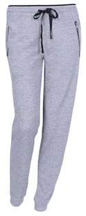 Szare dresowe spodnie ze srebrną nitką, lekko błyszczące. W pasie gumka i wiązanie. Posiadają dwie kieszonki zapinane na zamek. U dołu nogawek ściągacze. Skł...