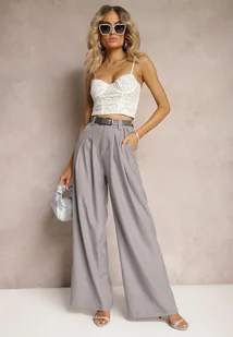 Szare Spodnie Palazzo High Waist z Szerokimi Nogawkami i Paskiem z Metalową Klamrą Oinna