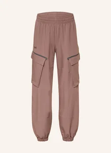 Kieszenie cargo. Elastyczne ściągacze na końcach nogawek. Detal z marką na nogawce. Elastyczny materiał