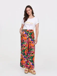 Spodnie damskie Top Secret z kolorowym nadrukiem. Spodnie damskie z prostymi szerokimi nogawkami zakończonymi delikatnym przeszyciem. Posiadają one praktyczne kieszenie po bokach oraz gumkę w talii, która podkreśla smukłość kobiecej sylwetki, będąc wykonanymi z dobrej gatunkowo oraz delikatnej dzianiny. Uroku dodaje im umiejscowiony na całości nadruk z motywem barwnych ręcznie malowanych kwiatów. Mogą być one z dużym powodzeniem stosowane zarówno jako element stylizacji połączonej ze sportowym T-shirtem, jak i również elegancką damską koszulą.