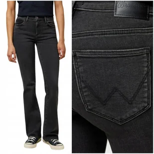 █ Wrangler Bootcut 625 Black Wash ROZSZERZANE ELASTYCZNE DAMSKIE SPODNIE JEANSOWE W30 L34 █ Damskie jeansy firmy Wrangler Model: Bootcut 625, boot, medium rise z kolekcji Body Bespoke Zapinane na zamek i metalowy, sygnowany guzik Kieszenie nitowane Średni stan Nogawki rozszerzane Kolor: czarno - szary (black wash) Jeans mocno rozciągliwy, z dodatkiem streczu Z tyłu, na pasku charakterystyczna naszywka z tłoczonym logo Wash (kod producenta): 112373181 - Rozmiar W30 L34 - 3034 drugi wymiar podajemy po mocnym (ale nie maksymalnym) rozciągnięciu: W / pas: 38 - 39,5 cm (x2) biodra (mierzone 5 cm powyżej kroku):