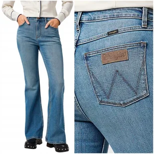 █ Wrangler Fierce Flare Sierra WYSOKIE DAMSKIE SPODNIE JEANSOWE DZWONY W29 L34 █ Damskie jeansy firmy Wrangler Model: Flare, flare, high rise z kolekcji We Care, Wrangler Zapinane na zamek i metalowy, sygnowany guzik Stan podwyższony Nogawki: dzwony Kolor: niebieski (sierra) Jeans średnio rozciągliwy, z dodatkiem streczu Z tyłu, na pasku charakterystyczna naszywka z logo Wash (kod producenta): 112364512 - Rozmiar W29 L34 - 29/34 drugi wymiar podajemy po mocnym (ale nie maksymalnym) rozciągnięciu: