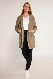 Długa bluza z kapturem i ozdobnymi napisami. Bluza z długimi rękawami, zapinana na napy. Na linii bioder wpuszczane kieszenie. Model ten idealnie sprawdzi się jako dopełnienie jesiennych stylizacji. Modelka na zdjęciu ma 177 cm wzrostu i prezentuje rozmiar 36.
