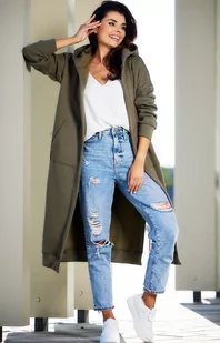 Długa bluza z kapturem khaki A613 z ozdobnymi rozcięciami na bokach i praktycznymi kieszeniami z przodu. Bluza może śmiało zastąpić kurtkę, czy płaszcz w chłodne dni. To must have w każdej kobiecej szafie!