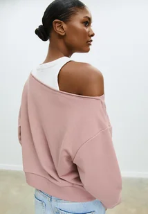 Bluza z dekoltem łódka, z długim rękawem i odkrytym ramieniem. Detal nadruku z przodu. Wykończona ściągaczami. Dostępna w kilku kolorach.