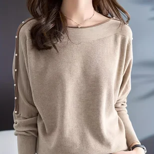 TEMU Elegancki Sweter Damski z Guzikami i Dekoltem Łódką - Beżowy & Kontrastowa Bluza w Kolorowe Paski, Wszechstronna Marynarka na Każdą Porę Roku do