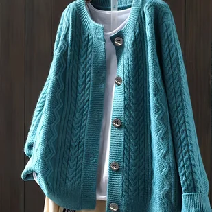 TEMU Kardigan Damski Retro z Guzikami - Miękka, Ciepła Turkusowa Bluza z Okrągłym Dekoltem i Ozdobnymi Guzikami na Wiosnę/Jesień, Średnio Elastyczny