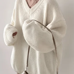 TEMU Sweter Damski Casual z Dekoltem w Serek - Oversize, Luźny Krój, Przewiewna Bluza na Jesień i Zimę, Miękka Tkanina, Kolorowy Pullover, Modne