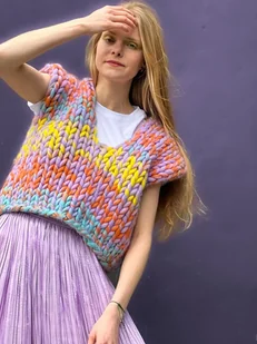 Kolorowa krótka kamizelka ovezsize na drutach, wykonana została ręcznie na drutach z 100% wełny. Aksamitna miękkość materiału, a także fakt, że jest to 100% naturalny surowiec, sprawi, że będzie to ukochana cz ...