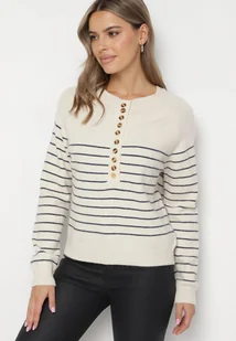 Beżowo-Niebieski Sweter w Paski Zapinany na Guziki przy Dekolcie Irinelas