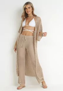 Beżowy Ażurowy Kardigan Narzutka z Metaliczną Nitką Rillia