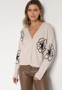 Beżowy Kardigan na Guziki w Haftowane Kwiaty Tustara