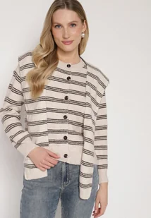 Beżowy Kardigan w Paski z Domieszką Wełny z Dodatkową Narzutką Fedina