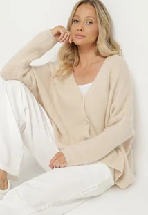 Beżowy Kardigan z Dekoltem w Serek z Dzianiny z Wełną i Moherem Lismio