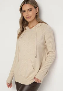 Beżowy Sweter z Kapturem i Kieszenią z Domieszką Kaszmiru Neriele