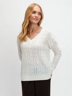Ten elegancki biały sweter z dekoltem w serek to doskonały wybór na każdą okazję. Sweter jest miękki i delikatny, idealnie układa się na sylwetce, zapewniając jednocześnie ciepło. Dzięki klasycznemu designowi i neutralnej kolorystyce, ten sweter z łatwością dopasujesz do różnych stylizacji, od codziennych po bardziej eleganckie.