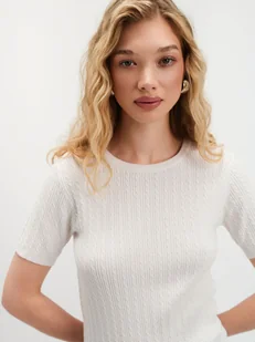Biały sweter z fakturą i krótkim rękawem to doskonały wybór na cieplejsze dni, kiedy chcesz połączyć wygodę z elegancją. Wyróżnia się subtelnym, ale kruchym splotem, który nadaje mu charakteru. Krótkie rękawy sprawiają, że jest idealny do noszenia samodzielnie lub pod lekką marynarką. Jego uniwersalna biel sprawia, że łatwo można go zestawić z różnymi stylizacjami, od casualowych dżinsów po elegancką spódnicę. To must-have w każdej garderobie miłośniczki klasycznych, ale nowoczesnych ubrań.
