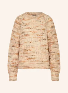Gruba dzianina prążkowana. Prosty krój. Okrągły dekolt. Rękawy raglanowe. Prążkowane ściągacze przy rękawach i rąbku. Melanżowy wygląd. Puszysty w dotyku materiał. Z alpaki