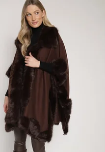Brązowe Ponczo z Wełną i Wiskozą Ozdobione Futerkiem Delatta