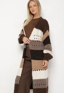 Brązowy Długi Kardigan Ażurowy w Paski z Domieszką Wełny i Wiskozy Ilomine