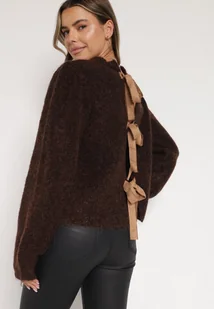 Brązowy Kardigan z Wełną i Bufiastymi Rękawami Wiązany na Plecach Tuseleia