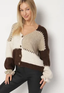Brązowy Patchworkowy Kardigan Oversize na Guziki z Falbanką na Rękawach i Wełną Atevita
