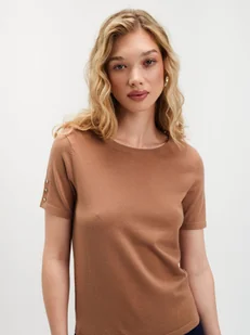 Postaw na ponadczasową klasykę w nowoczesnym wydadniu. Brązowy sweter basic z krótkim rękawem to idealna baza do wielu stylizacji - zarówno na co dzień jak i do pracy. Wyróżnia go dopasowany krój, który podkreśla sylwetkę oraz modne, dekoracyjne guziki na rękawach, nadające całości eleganckiego wyglądu.
