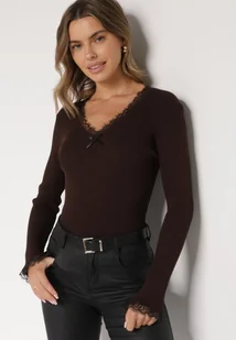 Brązowy Sweter z Wiskozą Ozdobiony Koronką i Kokardką Tusirea