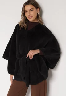 Czarne Ponczo z Futerkiem i Wiązanym Paskiem Monalena